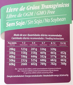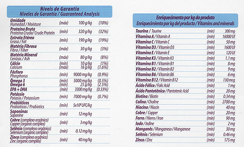 Composición: Carne de Pollo, Harina de Carne, Harina de Viscera de Pollo, Harina de Pescado, Harina de Chicharrón, Huevo deshidratado, Digest de Pollo, Arroz Integral, Harina de Trigo, Pulpa de Remolacha, Levaduras de Cervecería, Mananoligosacaridos, Fructoligosacaridos, Hexametafosfato de Sodio, Grasa de Pollo, Sal Común, Zeolita, Sulfato de Glucosamina, Sulfato de Condroitina, Extracto de Yuca, Cobre Aminoácido Quelato, Selenio Levadura, Zinc Aminoacido Quelato, Vitaminas (Taurina, Vitamina A, Vitamina C, Vitamina D3, Vitamina E, Vitamina K3, Vitamina B1, Vitamina B2, Vitamina B6, Vitamina B12, Acido Folico, Pantotenato de Cálcio, Biotina, Cloruro de Colina, Acido Nicotinico), Minerales (Sulfato de Cobre, Sulfato de Hierro, Iodato de Calcio, Sulfato de Manganeso, Selenito de Sodio, Oxido de Zinc, Cloruro de Potasio), Antioxidante.